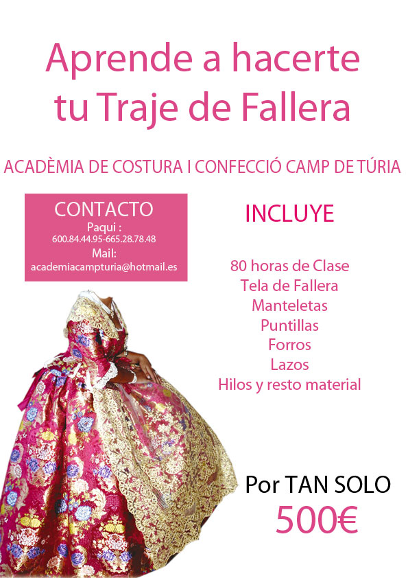 El precio de este Primer Curso es de tan sólo 500 Euros, está incluido todo el material HASTA LA PROPIA TELA DE FALLERA Y MANTELETAS,